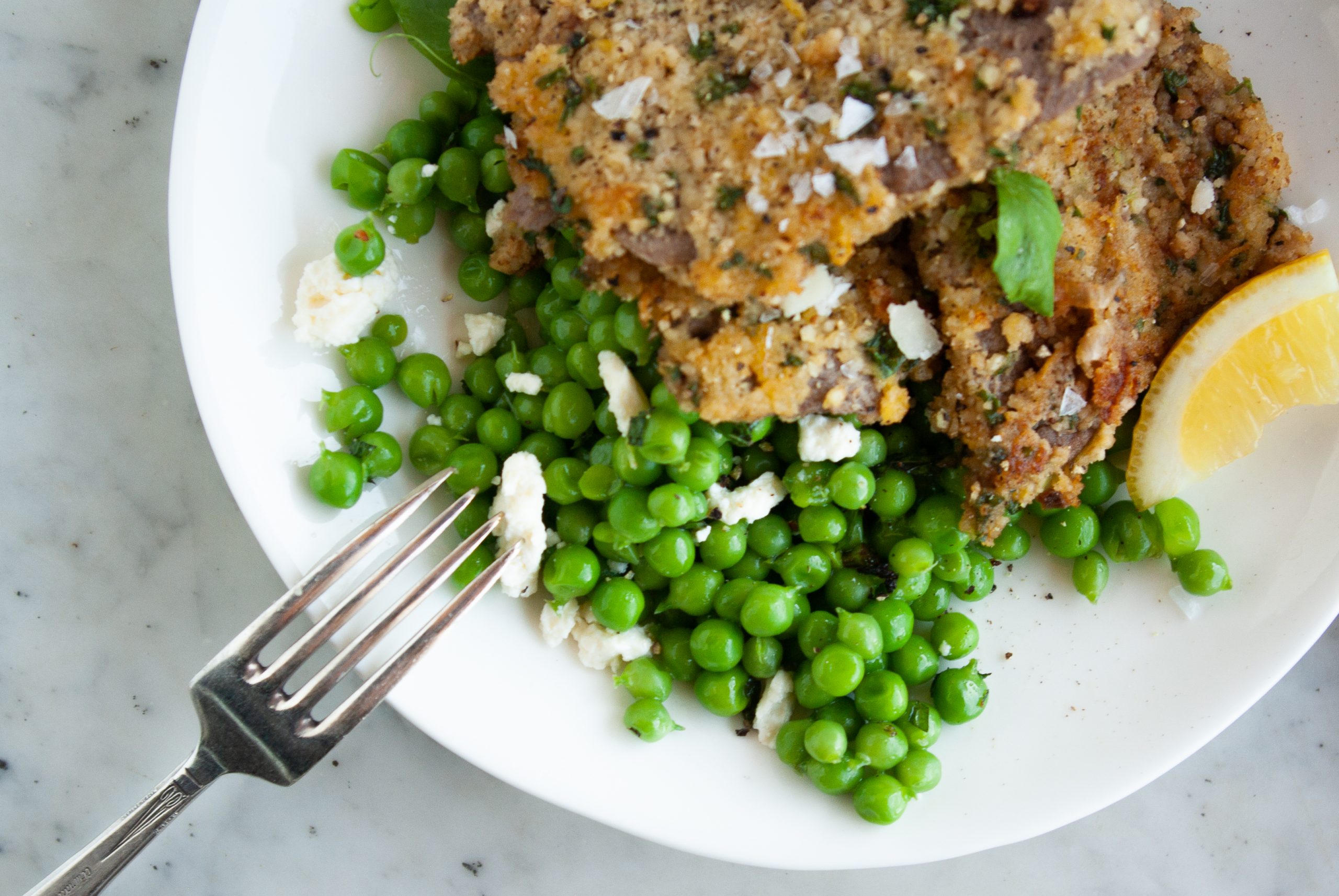 ALMOND AND HERB CRUSTED SCHNITZEL WITH PEA, MINT AND FETA SMASH